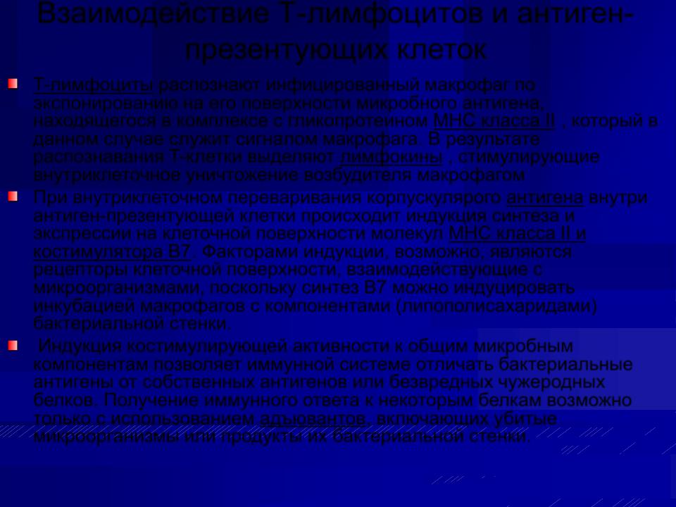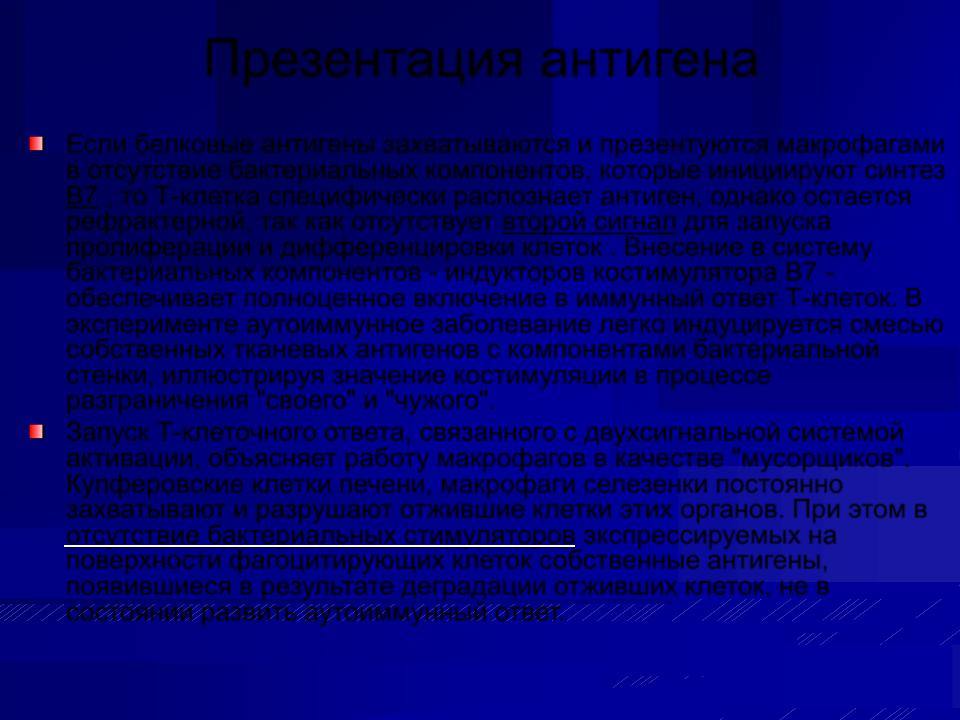 Если белковые антигены захватываются и презентуются макрофагами в отсутствие бактериальных компонентов, которые инициируют синтез В7 , то Т-клетка специфически распознает антиген, однако остается рефрактерной, так как отсутствует второй сигнал для запуска пролиферации и дифференцировки клеток . Внесение в систему бактериальных компонентов - индукторов костимулятора В7 - обеспечивает полноценное включение в иммунный ответ Т-клеток. В эксперименте аутоиммунное заболевание легко индуцируется смесью собственных тканевых антигенов с компонентами бактериальной стенки, иллюстрируя значение костимуляции в процессе разграничения "своего" и "чужого".
