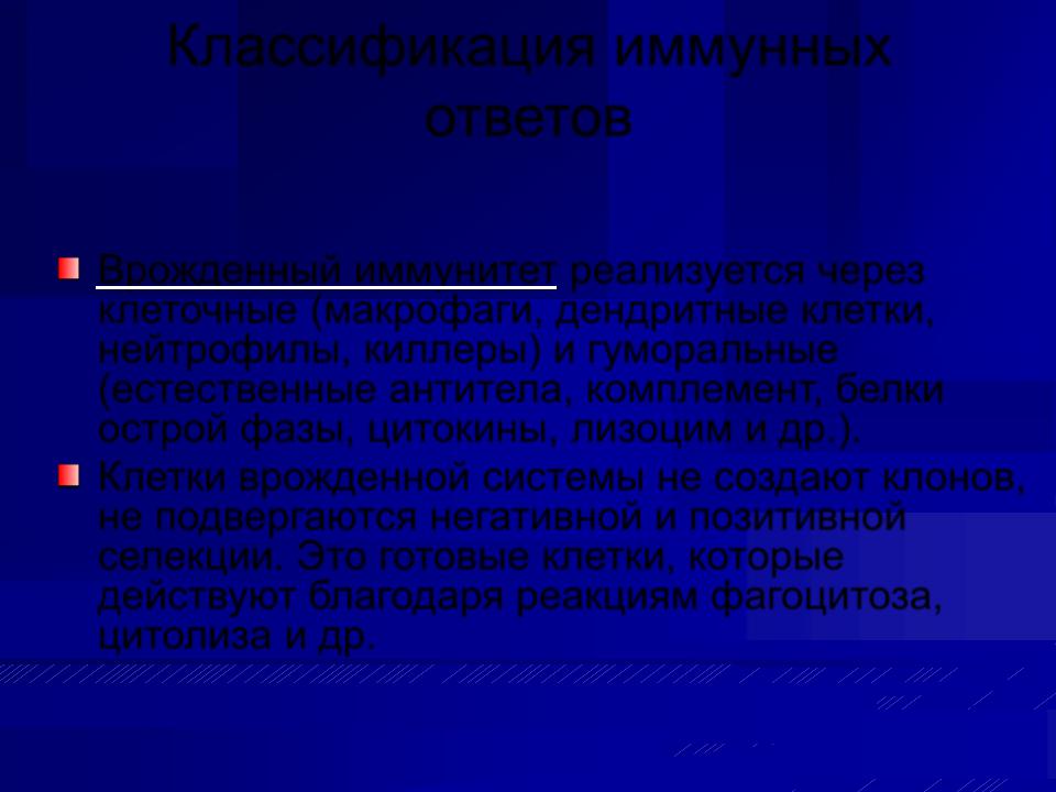 Врожденный иммунитет реализуется через клеточные (макрофаги, дендритные клетки, нейтрофилы, киллеры) и гуморальные (естественные антитела, комплемент, белки острой фазы, цитокины, лизоцим и др.).