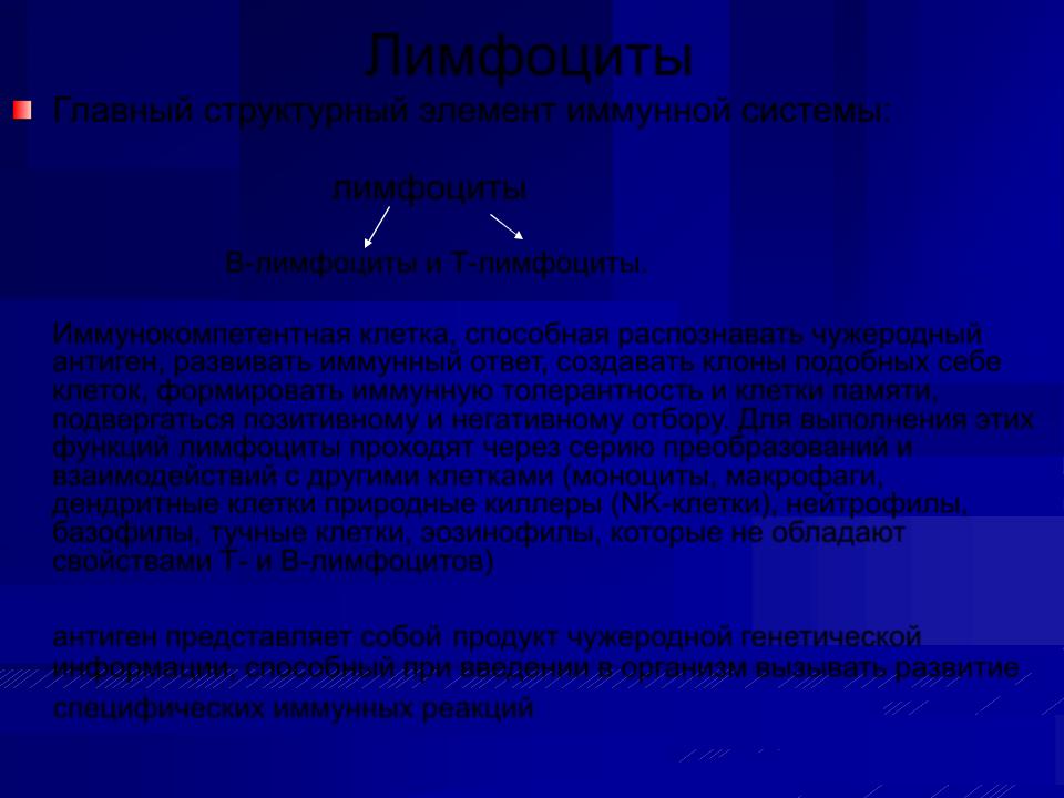 Иммунокомпетентная клетка, способная распознавать чужеродный антиген, развивать иммунный ответ, создавать клоны подобных себе клеток, формировать иммунную толерантность и клетки памяти, подвергаться позитивному и негативному отбору. Для выполнения этих функций лимфоциты проходят через серию преобразований и взаимодействий с другими клетками (моноциты, макрофаги, дендритные клетки природные киллеры (NK-клетки), нейтрофилы, базофилы, тучные клетки, эозинофилы, которые не обладают свойствами Т- и В-лимфоцитов)