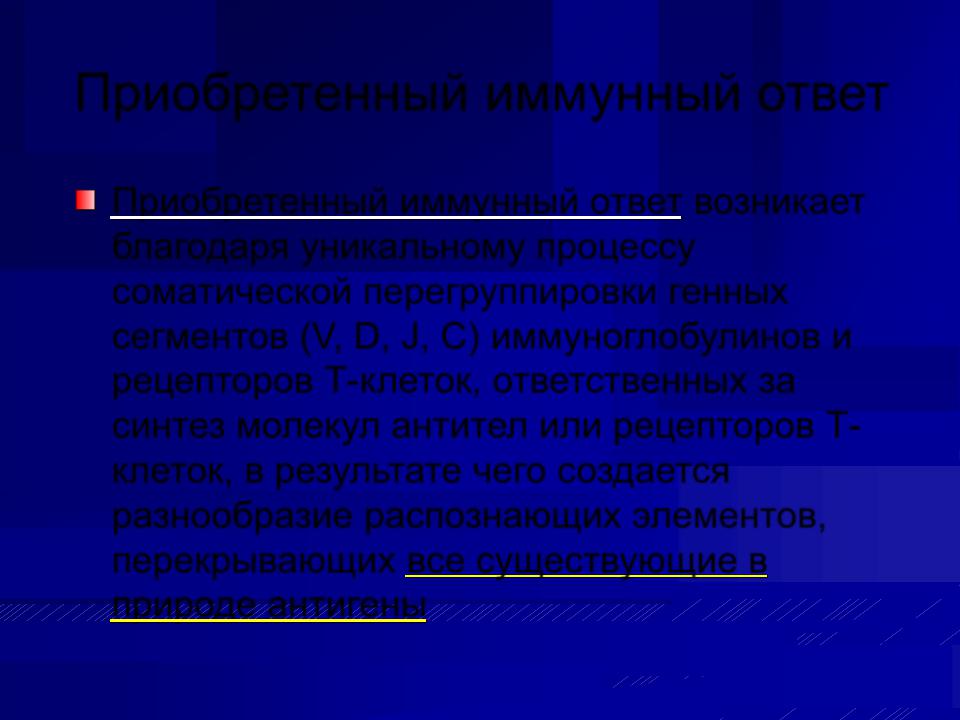 Приобретенный иммунный ответ возникает благодаря уникальному процессу соматической перегруппировки генных сегментов (V, D, J, C) иммуноглобулинов и рецепторов Т-клеток, ответственных за