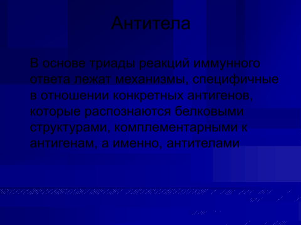 В основе триады реакций иммунного ответа лежат механизмы, специфичные в отношении конкретных антигенов, которые распознаются белковыми структурами, комплементарными к антигенам, а именно, антителами