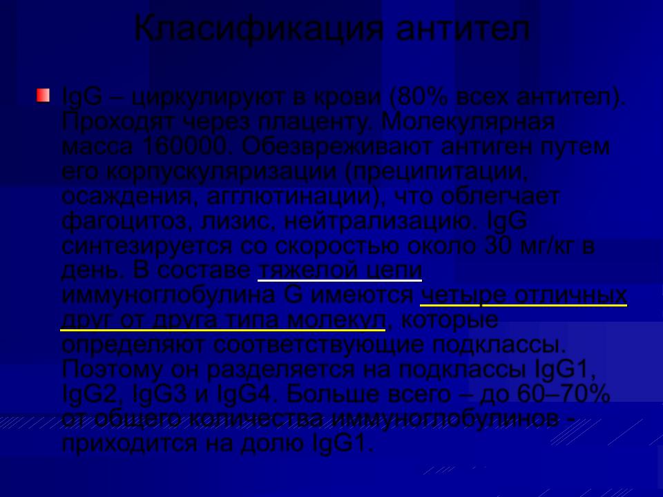 IgG – циркулируют в крови (80% всех антител). Проходят через плаценту. Молекулярная масса 160000. Обезвреживают антиген путем его корпускуляризации (преципитации, осаждения, агглютинации), что облегчает фагоцитоз, лизис, нейтрализацию. IgG синтезируется со скоростью около 30 мг/кг в день. В составе тяжелой цепи иммуноглобулина G имеются четыре отличных друг от друга типа молекул, которые определяют соответствующие подклассы. Поэтому он разделяется на подклассы IgG1, IgG2, IgG3 и IgG4. Больше всего – до 60–70%