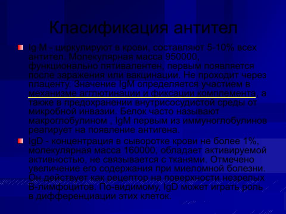 Ig М - циркулируют в крови, составляют 5-10% всех антител. Молекулярная масса 950000, функционально пятивалентен, первым появляется после заражения или вакцинации. Не проходит через плаценту. Значение IgM определяется участием в механизме агглютинации и фиксации комплемента, а также в предохранении внутрисосудистой среды от микробной инвазии. Белок часто называют макроглобулином , IgМ первым из иммуноглобулинов реагирует на появление антигена.