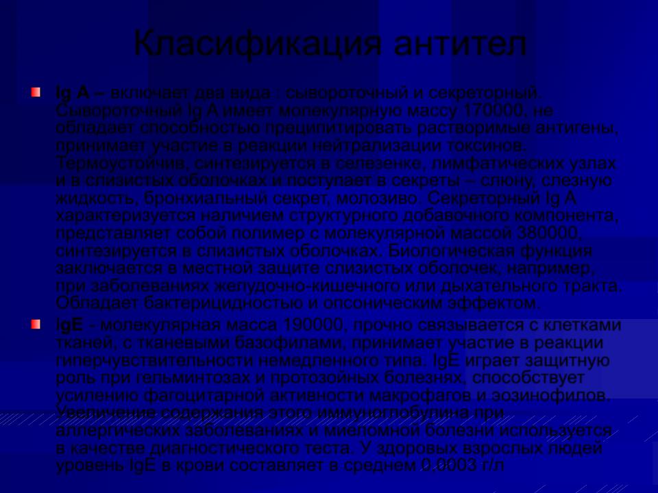 IgE - молекулярная масса 190000, прочно связывается с клетками тканей, с тканевыми базофилами, принимает участие в реакции гиперчувствительности немедленного типа. IgE играет защитную роль при гельминтозах и протозойных болезнях, способствует усилению фагоцитарной активности макрофагов и эозинофилов. Увеличение содержания этого иммуноглобулина при аллергических заболеваниях и миеломной болезни используется в качестве диагностического теста. У здоровых взрослых людей уровень IgЕ в крови составляет в среднем 0,0003 г/л