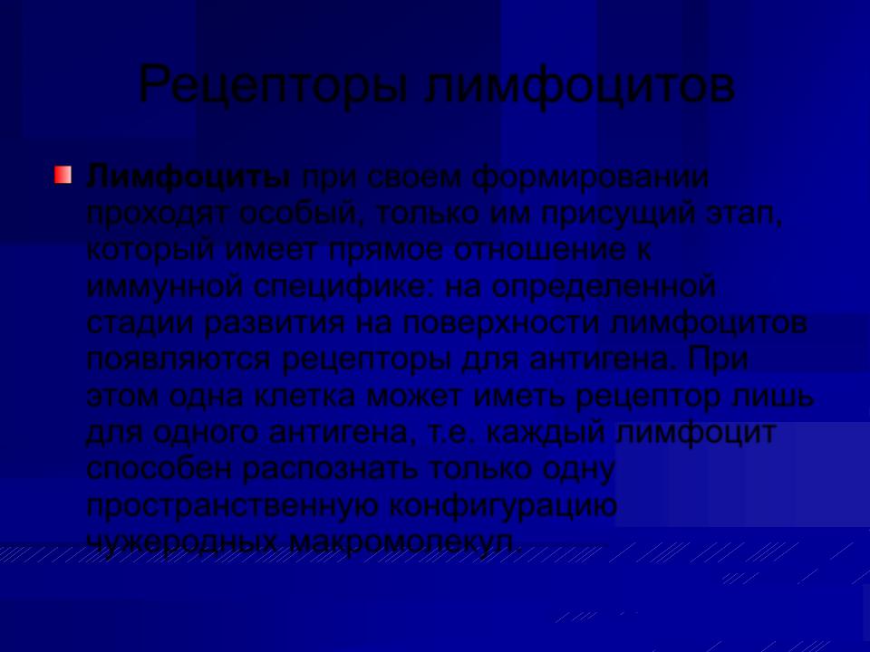 Лимфоциты при своем формировании проходят особый, только им присущий этап, который имеет прямое отношение к иммунной специфике: на определенной стадии развития на поверхности лимфоцитов появляются рецепторы для антигена. При этом одна клетка может иметь рецептор лишь