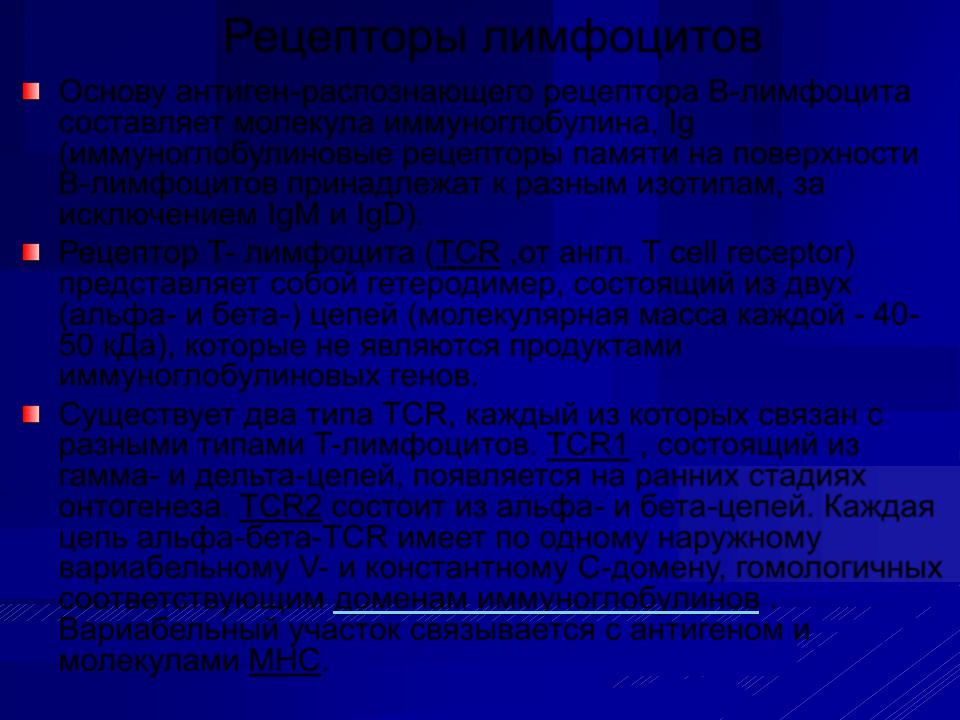 Рецептор T- лимфоцита (TCR ,от англ. Т cell receptor) представляет собой гетеродимер, состоящий из двух (альфа- и бета-) цепей (молекулярная масса каждой - 4050 кДа), которые не являются продуктами иммуноглобулиновых генов.