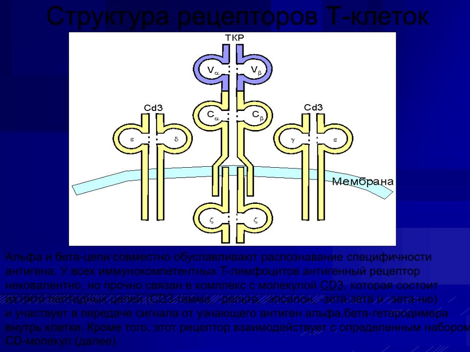Альфа и бета-цепи совместно обуславливают распознавание специфичности антигена. У всех иммунокомпетентных T-лимфоцитов антигенный рецептор нековалентно, но прочно связан в комплекс с молекулой CD3, которая состоит из пяти пептидных цепей (CD3-гамма, -дельта, -эпсилон, -зета-зета и -зета-ню) и участвует в передаче сигнала от узнающего антиген альфа,бета-гетеродимера