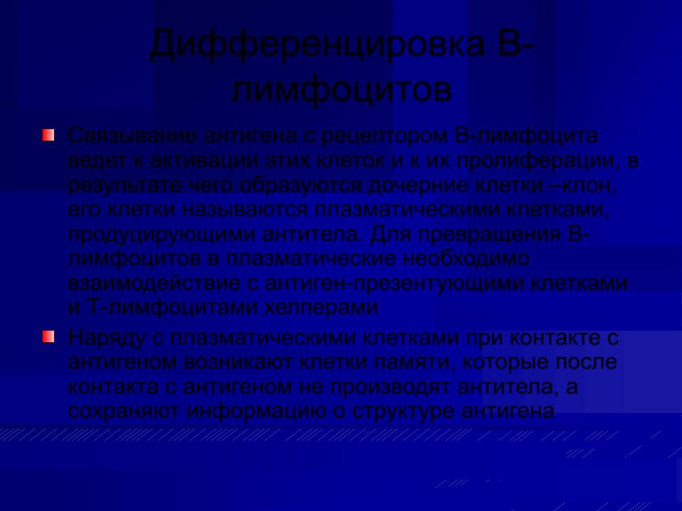 Связывание антигена с рецептором В-лимфоцита ведет к активации этих клеток и к их пролиферации, в результате чего образуются дочерние клетки –клон, его клетки называются плазматическими клетками, продуцирующими антитела. Для превращения В- лимфоцитов в плазматические необходимо взаимодействие с антиген-презентующими клетками и Т-лимфоцитами хелперами