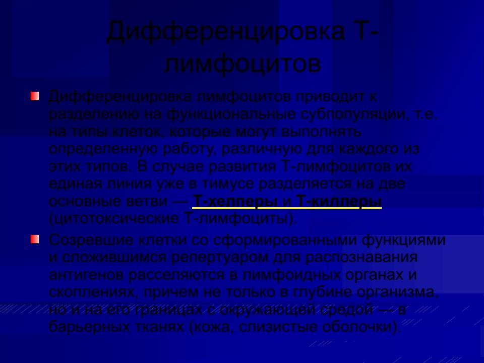Дифференцировка лимфоцитов приводит к разделению на функциональные субпопуляции, т.е. на типы клеток, которые могут выполнять определенную работу, различную для каждого из этих типов. В случае развития Т-лимфоцитов их единая линия уже в тимусе разделяется на две основные ветви — Т-хелперы и Т-киллеры