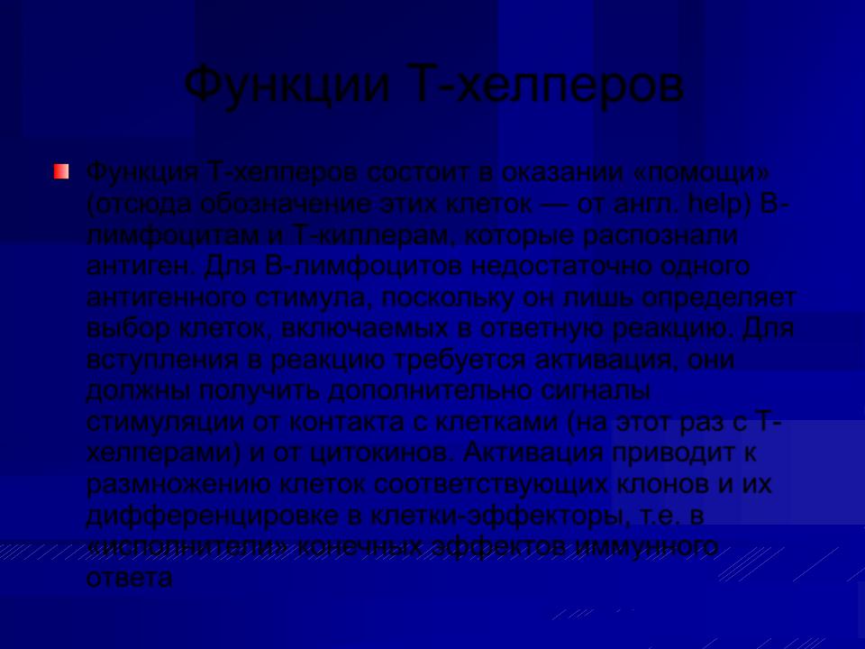 Функция Т-хелперов состоит в оказании «помощи» (отсюда обозначение этих клеток — от англ. help) В- лимфоцитам и Т-киллерам, которые распознали антиген. Для В-лимфоцитов недостаточно одного антигенного стимула, поскольку он лишь определяет выбор клеток, включаемых в ответную реакцию. Для вступления в реакцию требуется активация, они должны получить дополнительно сигналы