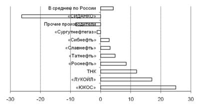 Рисунок 2.4 - Среднегодовые темпы роста добычи у российских нефтяных компаний в 2003 - 2006 гг., %
