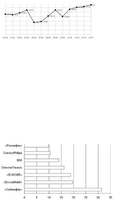 Темпы роста добычи нефти с газовым конденсатом в разрезе отдельных компаний в период 2003 – 2006 гг. представлены на рисунке 2.4. Лидерами по темпам роста добычи являются: Сибнефть, СИДАНКО и Славнефть, хотя говорить о явном лидерстве в данной ситуации нельзя.