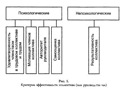 Китов А.И. обращает внимание на непсихологические критерии эффективности. На (рис.1) они представлены в обобщенном виде как результативность коллектива. К ним он относит: соблюдение коллективом и руководителем поставленных целей и задач; распределение времени в соответствии с поставленными целями и задачами; работа на качество и т.д.[6,с.13].