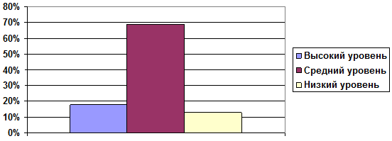 Анализ показал, что 18% детей находится на высоком уровне развития, 69% на среднем уровне и 13% детей 7-го года жизни на низком уровне.