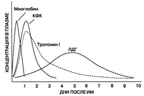Для диагностики инфаркта миокарда важное значение имеет определение активности ряда ферментов сыворотки крови, высвобождающихся в результате некротических изменений в миокарде (рис. 4).