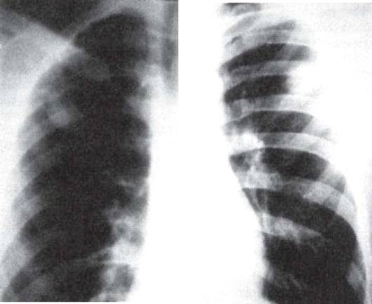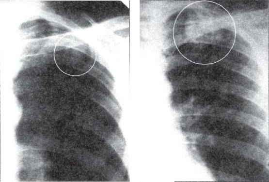 У больных с бронхолобулярным и округлым инфильтратом изменения в легких с помощью перкуссии и аускультации выявить часто не удается. Ранним симптомом прогрессирующего туберкулезного воспаления в легких является отставание пораженной половины грудной клетки при дыхании. Развитие локального воспаления плевры, прилежащей к пораженному легкому, обусловливает напряжение дыхательных мышц, а при прогрессировании и верхушечной локализации инфильтративных изменений - напряжение и болезненность мышц надплечья (симптом Воробьева- Поттенджера).