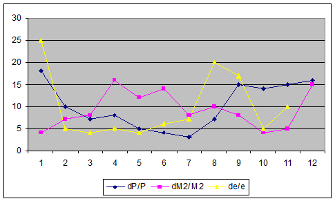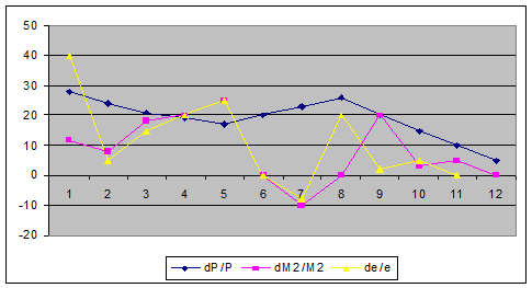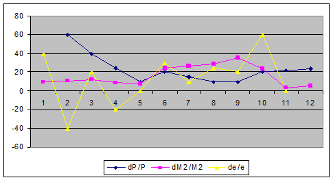 где d(М2)/М2, dР/Р, dе/е - соответственно темпы месячного прироста денежного агрегата М2, ИПЦ и обменного курса рубля к доллару, %.