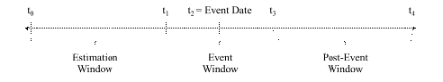 Рассмотрим подробнее указанные выше ключевые временные диапазоны. Событие, вокруг которого производится исследование в рамках event study, в соответствии с представленным разбиением происходит в момент t2 (= Event Date). Расчет нормального (типичного) уровня доходности производится в течение периода времени, который получил название Estimation Window (далее на основе нормального уровня доходности определяется наличие или отсутствие абнормальной доходности). Для рыночной доходности и доходности отдельного агента за рассматриваемый промежуток времени строится регрессия, представленная в уравнении (1), для определения характера взаимосвязи между данными показателями (рыночной доходностью и доходностью отдельного агента) в период, не затронутый информацией о ключевом событии, наступление которого происходит в момент t2. Различные исследователи предлагают выбирать момент t0 (момент начала Estimation Window) за 90-250 точек до наступления ключевого события. Под точками в данном инструментарии понимаются моменты (часы, дни), в которые производится учет релевантных показателей для исследования (ставки процента, значения доходности). Для исследования влияния forward guidance наиболее приемлемым определением точки является рабочий день, т.к. обновление уровней ставки процента для большинства организаций мира производится на ежедневной основе в рабочее время. После закрытия Estimation Window наступает открытие Event Window, которое в литературе по продолжительности чаще всего варьируется от 2 до 6 точек (1-3 точки до наступления ключевого события, 1-3 точки - после наступления ключевого события). Event Window представляет собой период, в течение которого потенциально может быть обнаружена положительная абнормальная доходность. Для выявления наличия/отсутствия абнормальной доходности производится сравнение актуального уровня доходности отдельного агента с прогнозируемым на основе периода Estimation Window (на базе уравнения (2)). После закрытия Event Window наступает период Post-Event Window - период после потенциального проявления абнормального уровня доходности. Чаще всего данный промежуток времени не исследуется, однако ему может быть уделено внимание при анализе, например, долгосрочных эффектов от получения инсайдерской информации.