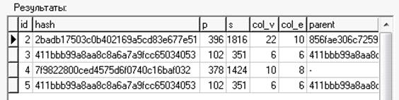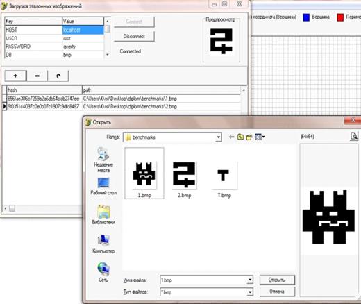 //выводим массив таблицыTForm1.StringGridDrawCell(Sender: TObject; ACol, ARow: Integer;: TRect; State: TGridDrawState);form1.StringGrid1.Cells[ACol,ARow]<>'' thenform1.StringGrid1.Cells[Acol, ARow] = '0' then.StringGrid1.Canvas.Brush.Color:=clYellow;.StringGrid1.Canvas.FillRect(Rect);.StringGrid1.Canvas.TextOut(Rect.Left,Rect.Top, form1.StringGrid1.Cells[Acol,Arow]);;Perimeter(form1.StringGrid1, Acol,Arow) = True then.StringGrid1.Canvas.Brush.Color:=clRed;.StringGrid1.Canvas.FillRect(Rect);.StringGrid1.Canvas.TextOut(Rect.Left,Rect.Top, form1.StringGrid1.Cells[Acol,Arow]);;Vertex(StringGrid1, Acol, Arow) = True then.StringGrid1.Canvas.Brush.Color:=clBlue;.StringGrid1.Canvas.FillRect(Rect);.StringGrid1.Canvas.TextOut(Rect.Left,Rect.Top, form1.StringGrid1.Cells[Acol,Arow]);;Extrema(StringGrid1, Acol, Arow) = True then.StringGrid1.Canvas.Brush.Color:=clPurple;.StringGrid1.Canvas.FillRect(Rect);.StringGrid1.Canvas.TextOut(Rect.Left,Rect.Top, form1.StringGrid1.Cells[Acol,Arow]);;Centroid(StringGrid1, Acol, Arow) = True then.StringGrid1.Canvas.Brush.Color:=clGreen;.StringGrid1.Canvas.FillRect(Rect);.StringGrid1.Canvas.TextOut(Rect.Left,Rect.Top, form1.StringGrid1.Cells[Acol,Arow]);;.StringGrid1.Canvas.Brush.Color:=clWhite;.StringGrid1.Canvas.FillRect(Rect);.StringGrid1.Canvas.TextOut(Rect.Left,Rect.Top, form1.StringGrid1.Cells[Acol,Arow]);;;TForm1.StringGrid2DrawCell(Sender: TObject; ACol, ARow: Integer;: TRect; State: TGridDrawState);form1.StringGrid2.Cells[ACol,ARow]<>'' thenform1.StringGrid2.Cells[Acol, ARow] = '0' then.StringGrid2.Canvas.Brush.Color:=clYellow;.StringGrid2.Canvas.FillRect(Rect);.StringGrid2.Canvas.TextOut(Rect.Left,Rect.Top, form1.StringGrid2.Cells[Acol,Arow]);;Perimeter(form1.StringGrid2, Acol,Arow) = True then.StringGrid2.Canvas.Brush.Color:=clRed;.StringGrid2.Canvas.FillRect(Rect);.StringGrid2.Canvas.TextOut(Rect.Left,Rect.Top, form1.StringGrid2.Cells[Acol,Arow]);;Vertex(StringGrid2, Acol, Arow) = True then.StringGrid2.Canvas.Brush.Color:=clBlue;.StringGrid2.Canvas.FillRect(Rect);.StringGrid2.Canvas.TextOut(Rect.Left,Rect.Top, form1.StringGrid2.Cells[Acol,Arow]);;Extrema(StringGrid2, Acol, Arow) = True then.StringGrid2.Canvas.Brush.Color:=clPurple;.StringGrid2.Canvas.FillRect(Rect);.StringGrid2.Canvas.TextOut(Rect.Left,Rect.Top, form1.StringGrid2.Cells[Acol,Arow]);;Centroid(StringGrid2, Acol, Arow) = True then.StringGrid2.Canvas.Brush.Color:=clGreen;.StringGrid2.Canvas.FillRect(Rect);.StringGrid2.Canvas.TextOut(Rect.Left,Rect.Top, form1.StringGrid2.Cells[Acol,Arow]);;.StringGrid2.Canvas.Brush.Color:=clWhite;.StringGrid2.Canvas.FillRect(Rect);.StringGrid2.Canvas.TextOut(Rect.Left,Rect.Top, form1.StringGrid2.Cells[Acol,Arow]);;;TForm1.Button1Click(Sender: TObject);List: TList;.mySQLDatabase1.ConnectionCharacterSet:='cp1251';.mySQLDatabase1.Host := Form1.ValueListEditor1.Values['HOST'];.mySQLDatabase1.UserName := Form1.ValueListEditor1.Values['USER'];.mySQLDatabase1.UserPassword:=form1.ValueListEditor1.Values['PASSWORD'];.mySQLDatabase1.Connect;.mySQLDatabase1.SelectDB(form1.ValueListEditor1.Values['DB']);.mySQLTable1.TableName:='list';.mySQLTable1.Open;form1.mySQLDatabase1.Connected = True then.MainMenu1.Items.Find('DB').Find('Connect').Visible:=False;.MainMenu1.Items.Find('DB').Find('Disconnect').Visible:=True;.MainMenu1.Items.Find('Изображение').Enabled:=True;.ListBox1.Enabled:=True;.Button5.Enabled:=True;.Button3.Enabled:=True;.Label3.Caption:='Connected';.Button1.Enabled := False;;;TForm1.Button4Click(Sender: TObject);.Show;;TForm1.Button5Click(Sender: TObject);.mySQLDatabase1.Disconnect;form1.mySQLDatabase1.Connected = False then.ListBox1.Enabled:=False;.MainMenu1.Items.Find('Изображение').Find('Анализ').Enabled:=False;.MainMenu1.Items.Find('DB').Find('Connect').Visible:=True;.MainMenu1.Items.Find('DB').Find('Disconnect').Visible:=False;.MainMenu1.Items.Find('Изображение').Enabled:=False;.Button5.Enabled:=False;.Label3.Caption:='Disconnected';.Button1.Enabled := True;.Button3.Enabled := False;.Button6.Enabled := False;(ExtractFileDir(ParamStr(0)) + '\\area\\area.bmp', form1.Image1);(ExtractFileDir(ParamStr(0)) + '\\area\\area.bmp', form1.Image2);(form1.StringGrid2);(form1.StringGrid1);;;TForm1.Button6Click(Sender: TObject);st:TStringList;,hash2,p,s,p2,s2,col_v,col_e,col_v2,col_e2:string;,parent:variant;.DBGrid1.Enabled:=True;:= TStringList.Create();.Clear;:= QuotedStr(getValHash(form1.StringGrid1));:= getValP(form1.StringGrid1);:= getValS(form1.StringGrid1);_v := getValVertex(form1.StringGrid1);_e := getValExtrems(form1.StringGrid1);.Add('SELECT * FROM benchmarks WHERE hash=' + hash + ';');.mySQLTable2.TableName := 'benchmarks';.mySQLTable2.Open;.mySQLQuery1.SQL := st;.mySQLQuery1.Active := True;:= form1.mySQLQuery1.FieldValues['path'];:= form1.mySQLQuery1.FieldValues['hash'];.mySQLQuery1.Active := False;path <> Null thenparent <> '-' then(path, form1.Image2);(form1.StringGrid2, form1.Image2);;:= QuotedStr(getValHash(form1.StringGrid2));:= getValP(form1.StringGrid2);:= getValS(form1.StringGrid2);('Совпадение с эталоном' + chr(13) + 'hash (изображения): ' + hash + chr(13) + 'hash (эталона): ' + hash2 + chr(13) + 'P (изображения): ' + p + chr(13)+ 'P (эталона): ' + p2 + chr(13) + 'S (изображения): ' + s + chr(13)+ 'S (эталона): ' + s2);.mySQLDatabase1.Execute('INSERT INTO list VALUES(0,' + hash + ',' + p + ','+ s + ',' + col_v + ',' + col_e + ',' + QuotedStr(parent) + ',' + QuotedStr(StringReplace(form1.Label9.Caption, '\', '\\',[rfReplaceAll, rfIgnoreCase])) + ');');.Clear;.Add('SELECT * FROM benchmarks WHERE p=' + p + ' and s=' + s + ';');.mySQLQuery1.SQL := st;.mySQLQuery1.Active:=True;:= form1.mySQLQuery1.FieldValues['path'];:= form1.mySQLQuery1.FieldValues['hash'];path <> Null thenparent <> '-' then(path, form1.Image2);(form1.StringGrid2, form1.Image2);;:= QuotedStr(getValHash(form1.StringGrid2));:= getValP(form1.StringGrid2);:= getVal