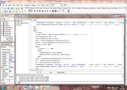 interface, Messages, SysUtils, Variants, Classes, Graphics, Controls, Forms,, ExtCtrls, StdCtrls, ComCtrls, Grids, md5Hash, DB, mySQLDbTables,, DBCtrls, mySQLDirectQuery,MySQLBatch, ValEdit, Menus;= class(TForm): TLabel;: TLabel;: TListBox;: TListBox;: TPageControl;: TTabSheet;: TTabSheet;: TStringGrid;: TStringGrid;: TButton;: TButton;: TGroupBox;: TImage;: TButton;: TGroupBox;: TImage;: TStringGrid;: TDBGrid;: TValueListEditor;: TDataSource;: TmySQLTable;: TmySQLDatabase;: TButton;: TLabel;: TButton;: TmySQLQuery;: TmySQLTable;: TDataSource;: TShape;: TLabel;: TShape;: TLabel;: TShape;: TLabel;: TShape;: TLabel;: TMainMenu;: TMenuItem;: TMenuItem;: TMenuItem;: TMenuItem;: TMenuItem;: TMenuItem;: TMenuItem;: TMenuItem;: TMenuItem;: TLabel;: TDBNavigator;: TMenuItem;: TLabel;FormCreate(Sender: TObject);Button3Click(Sender: TObject);ListBox1DblClick(Sender: TObject);ListBox2Click(Sender: TObject);ListBox1Click(Sender: TObject);StringGridDrawCell(Sender: TObject; ACol, ARow: Integer;: TRect; State: TGridDrawState);StringGrid2DrawCell(Sender: TObject; ACol, ARow: Integer;: TRect; State: TGridDrawState);Button1Click(Sender: TObject);Button4Click(Sender: TObject);Button5Click(Sender: TObject);Button6Click(Sender: TObject);Connect1Click(Sender: TObject);Disconnect1Click(Sender: TObject);N3Click(Sender: TObject);Image3Click(Sender: TObject);N4Click(Sender: TObject);N5Click(Sender: TObject);FormClose(Sender: TObject; var Action: TCloseAction);DBGrid1CellClick(Column: TColumn);