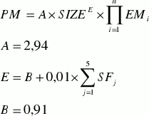 где •SIZE - размер продукта в KSLOC или в количестве функциональных точек без включения поправочных коэффициентов (UFP), определенном по методике 1FPUG, с последующим преобразованием в количество строк кода.