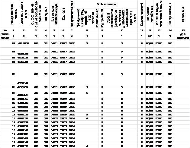 Имеют 4 знака. Для кодирования грузоотправителей и грузополучателей выделен диапазон номеров 1001-9999. Для грузоотправителя выбираю код 1001, для грузополучателя - 2002 (ст. Рябово), 2003 (ст. Любань), 2004 (ст. Чудово).