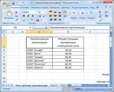 Цель решения задачи. Предприятие ООО «Анаконда» сдает в аренду офисные помещения в центре города различным организациям. Помимо аренды объектов, компания обеспечивает охрану и ежедневную влажную уборку. Ввиду того, что услуги оказывают из расчета площади арендуемого помещения, а доход рассчитывается исходя из суммы предоставленных услуг, необходимо вести учет всех доходных статей по каждой организации и высчитывать общую сумму дохода. Для этого необходимо учитывать все изменяемые параметры: число организаций, арендуемую площадь, цены за услуги. Корректный учет всех из них ставит перед ООО «Анаконда» задачу построения системы обработки актуальной информации по исходным данным. Задача, которая будет решаться в программной среде MS Excel ежемесячно, называется «Учет доходов организации».
