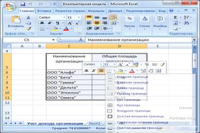 . Создайте видимые границы образовавшейся таблицы · Выделите указанный диапазон курсором при нажатой левой клавиши мыши. · Выберите в треугольнике значка «границы» пункт «все границы» 5. Те же операции проделайте с Таблицами 2 и 3 (без вычислений). 6. В Таблице 3 на пересечении строки ООО