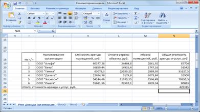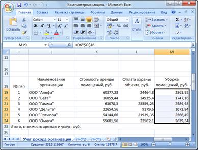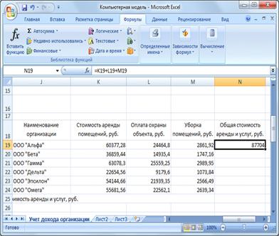 . Делаем активной ячейку N19 (пересечение строки ООО «Альфа» и столбца «Общая стоимость аренды и услуг»). 11. Вбиваем в неё формулу суммы значений стоимости оказываемых услуг для компании ООО «Альфа». · Формула имеет вид =K19+L19+M19 Нажимаем Enter · Знаки равенства, сложения вбиваем