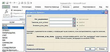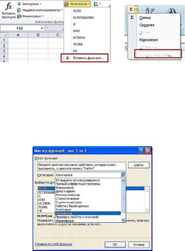 •Кнопка Логические отображает список логических функций, которые вы можете применить к данным. Это функции: И, ИЛИ, НЕ, ЕСЛИ, ИСТИНА, ЛОЖЬ. Например, вы можете использовать функцию ЕСЛИ, для того чтобы вычислить, можете ли вы себе позволить взять ссуду на покупку автомобиля.