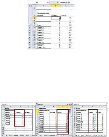 Вы также можете консолидировать данные по категориям, используя в качестве основы для объединения заголовки столбцов или строк. Такой способ консолидации более гибкий. Например, если данные по Товарам на разных листах находятся в разных строках таблицы, то при консолидации по категориям такие данные будут объединены (рис. 5.13).