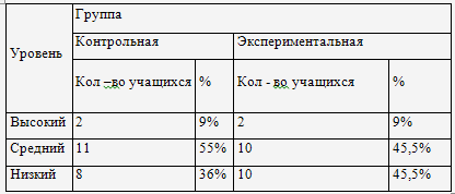 Данные нулевого среда показали, что высокий уровень познавательной активности наблюдается всего лишь у 9 процентов учащихся эксперементального и контрольного классов. Средний уровень наблюдался у 55% детей в контрольном классе и 45,5% в экспериментальном. Низкий уровень наблюдался у 36% в контрольном классе и 45,5% - в экспериментальном.