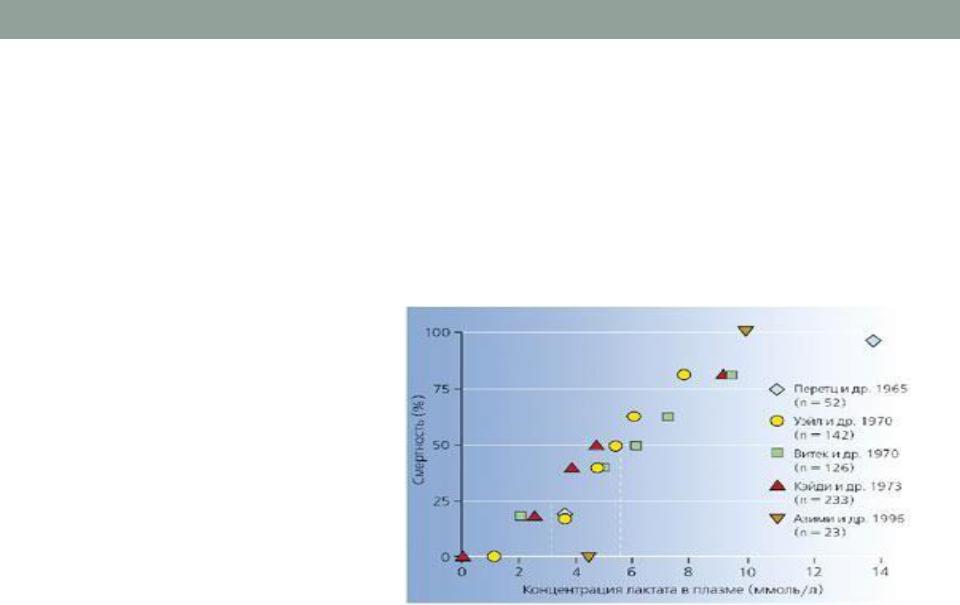 Зависимость "смертность - концентрация лактата" в плазме у пациентов, находящихся в состоянии шока