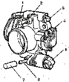 заслонки; 5 - регулятор холостого хода; 6 - штуцер для продувки адсорбера; 7 -