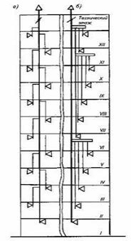 зданий: система с вертикальными коллекторами (а); система с горизонтальными
