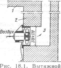 Недостаточность вентиляционных обменов в газифицированных кухнях резко повышает концентрацию в них оксида углерода. Если устранить этот недостаток нельзя, целесообразно вместо снятой вытяжной решетки устанавливать вентилятор, имеющий производительность 200 м3/ч (рис. 2.1). Наилучший эффект он дает при установке на расстоянии не более 0,5 м от вертикальной оси плиты; избыточные вентиляционные обмены, вызывающие переохлаждение помещений (обычно зимой в помещениях нижних этажей).
