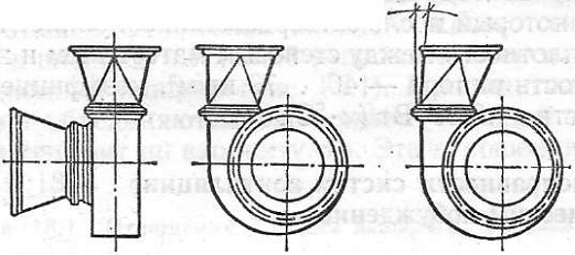 5) неправильно расположены патрубки у центробежного вентилятора; выходной диффузор или отвод за вентилятором отклонены в сторону, противоположную направлению движения воздуха в кожухе вентилятора; входной патрубок расположен эксцентрично по отношению к входному отверстию. Правильное расположение патрубков у центробежного вентилятора показано на рис. 2.1. Производительность вентилятора значительно снижается и в случаях, когда к входному его патрубку присоединен отвод;