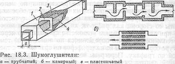 Для снижения шума, возникающего при работе вентиляторов, до уровня, допускаемого для здания данного назначения санитарными нормами, применяют шумоглушители - трубчатые, камерные и пластинчатые (рис. 2.2). Трубчатый шумоглушитель состоит из внутренней трубы (перфорированная сталь или металлическая сетка) 4, устанавливаемой в кожухе 1 на перегородках 2, и звук поглощающего материала 3. Присоединяют шумоглушители к воздуховодам на фланцах.