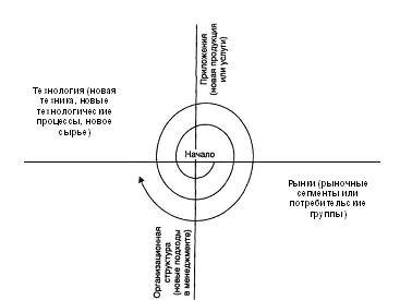 По мнению Ф. Янсена [29,с.13], инновационный процесс можно представить в виде так называемой арены инноваций. Прикладное значение предлагаемого Янсеном подхода состоит в том, что в пределах арены инноваций можно позиционировать фирмы по комбинациям их технологий, приложений (новой продукции и услуг), рынков и организационных структур. Переход от одной позиции к другой, уникальной и новой, на этой арене является инновацией и следствием ведения компанией инновационной деятельности. Если рассматривать последовательность указанного перехода компании во времени, то получим траекторию инновации (рис.1).