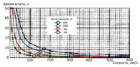Следует заметить, что ряд экспертов переводит проблему повышения скорости в другую плоскость, задаваясь вопросами о том, какова целесообразность выхода в постоянной коммерческой эксплуатации за предел скорости 350 км/ч, какова будет цена приращения каждых последующих 10 или 50 км/ч для компании-оператора, инвестора и как это реально улучшит предлагаемую пассажиру транспортную услугу, цена которой, естественно, станет более высокой. На графике, представленном на рис 1, показана взаимосвязь времени в пути и скорости движения для маршрутов протяженностью 250, 500, 1000 и 1500 км.