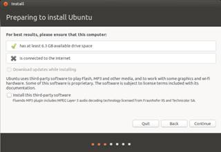 Если выбрать «InstallUbuntu», то пользователю выведется предварительная информация о наличии свободного места на диске и наличии подключения к Интернет. Так же есть возможность выбрать, устаналивать ли MP3-кодеки: