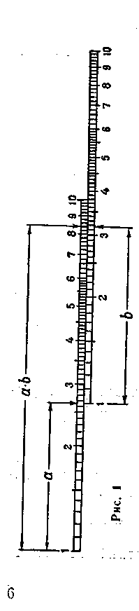 Кроме того, у десятичных логарифмов (логарифмы, основанием которых является число 10) мантиссы логарифмов чисел N, 10N, 100N и т.д. равны между собой. Это позволяет на всю длину линейки нанести шкалу с одним или двумя — тремя разными интервалами от О до 1 (от lg 1 до lg 10), оцифровать их (от 1 до 10 — первый интервал, от 10 до 100 — второй и от 100 до 1000 — третий) и пользоваться ими для любых чисел, величина которых кратна 10, Так, деление 60 шкалы I (см. рис.3) можно считать равным 0,6; 6; 600 и т. д.