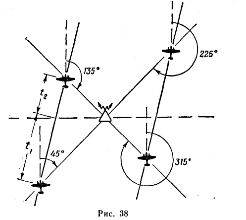 t2 — время полета в сек. с момента, когда КУР изменяется от 90 до 135° или от 270 до 225°.