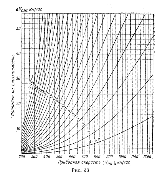 Примечания: 1. Пересчет скорости на указанных шкалах производится без учета сжимаемости воздуха. При скоростях полета больше 350—400 км/час по прибору и на высоте полёта больше 4000—5000 м в приборную скорость необходимо вводить поправку на сжимаемость воздуха, которая определяется по графику (рис. 33).