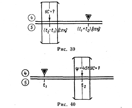 Примечание. Знак угла сноса определяется по следующему правилу: если пеленгуемая радиостанция находится слева и если время полета t2 больше t1 то знак сноса плюс ( + ), при t2 меньше t1 — знак сноса минус (—);-если же пеленгуемая радиостанция находится справа, то при времени полета t2 больше t1 знак сноса минус (—), а при t2 меньше t1 —знак сноса плюс (+). При решении задачи во втором случае величина и знак угла сноса определяются из равенства