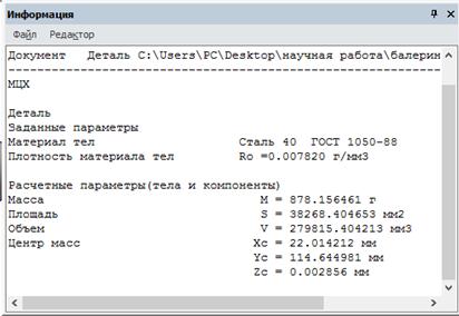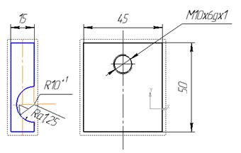 Немаловажным является способ крепления траверс к корпусу, так как от выбранного способа и расположения поперечных траверс буде зависит работа нашего инструмента. Траверсы будут крепиться к корпусу с помощью крепления скобы. Выполнена из материала Сталь 40. В скобе сделано одно сквозное отверстие под винт М 10х 6gх 1 ГОСТ 17473-80. Общую шероховатость заложим Ra 1,6 и немаловажным, является радиус 10мм, там шероховатость будет Ra 1,25. Скоба была выполнена в 2D и 3D чертежах, смотри рисунок 5.4 и 5.5. Так же при помощи программы подсчитаем массу скобы (рисунок 5.6).