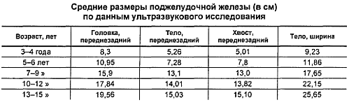 Средневозрастные размеры поджелудочной же лезы при ультразвуковом исследовании представлены в таблице: