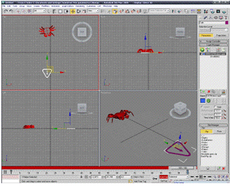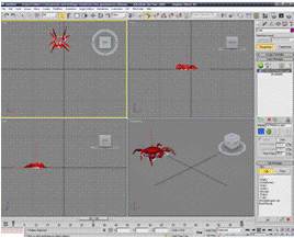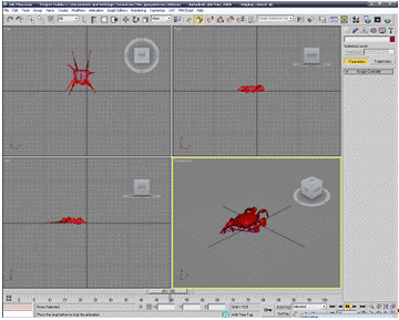 Шаг 3. Чтобы создать анимацию, объект Crab должен быть выделен. Активировать кнопку Auto Key. Переместить ползунок в кадр 100 и, пользуясь инструментом Select And Move, передвинуть краба вперёд. Закончив, выключить Auto Key. Теперь, при перемещении ползунка, паук будет идти вперёд.