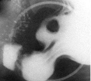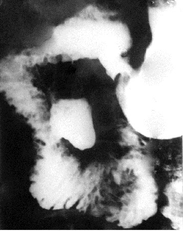 Рис. 12. Рентгенограмма выходного отдела желудка и 12-перстной кишки в правой косой проекции. В нисходящей части 12-перстной кишки по медиальному контуру выявляется ограниченное увеличение тени округлой формы с «ножкой» - дивертикул.