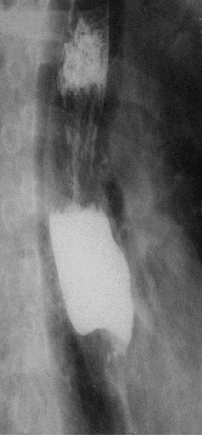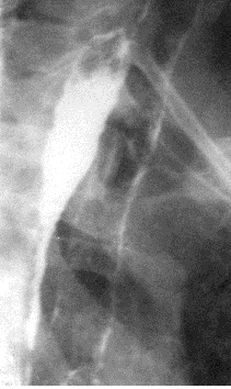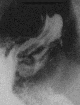 Рис. 15. Рентгенограмма пищевода в правой косой проекции. Определяется выраженное сужение средней и нижней трети его грудного отдела после перенесенного химического ожога.